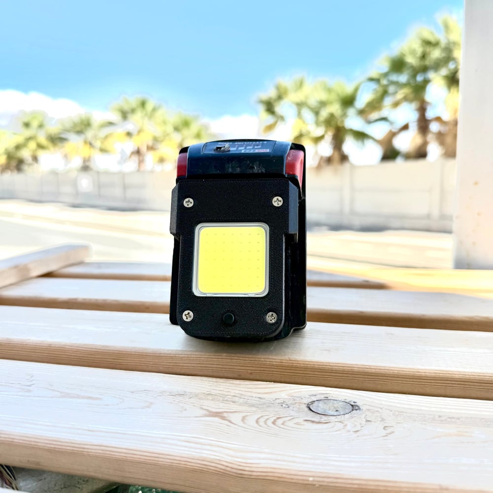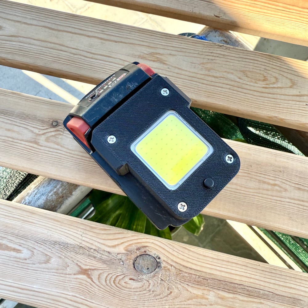 Designed and 3D-printed by MarioMaker, this ultra-tough work light adapter transforms your favorite power tool battery into a bright, efficient LED work light — perfect for workshops, garages, camping, or construction sites.